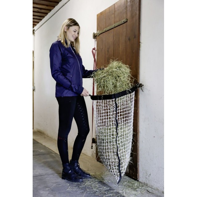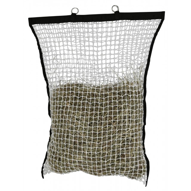 Duża, wytrzymała siatka na siano o wymiarach 90 x 110 cm i rozmiarze oczek 3 x 3 cm. Wzmocniony rzep przy otworze zapobiega przypadkowemu otwarciu worka na siano, a praktyczne haczyki do zawieszania, mogą również służyć jako pomoc przy napełnianiu.