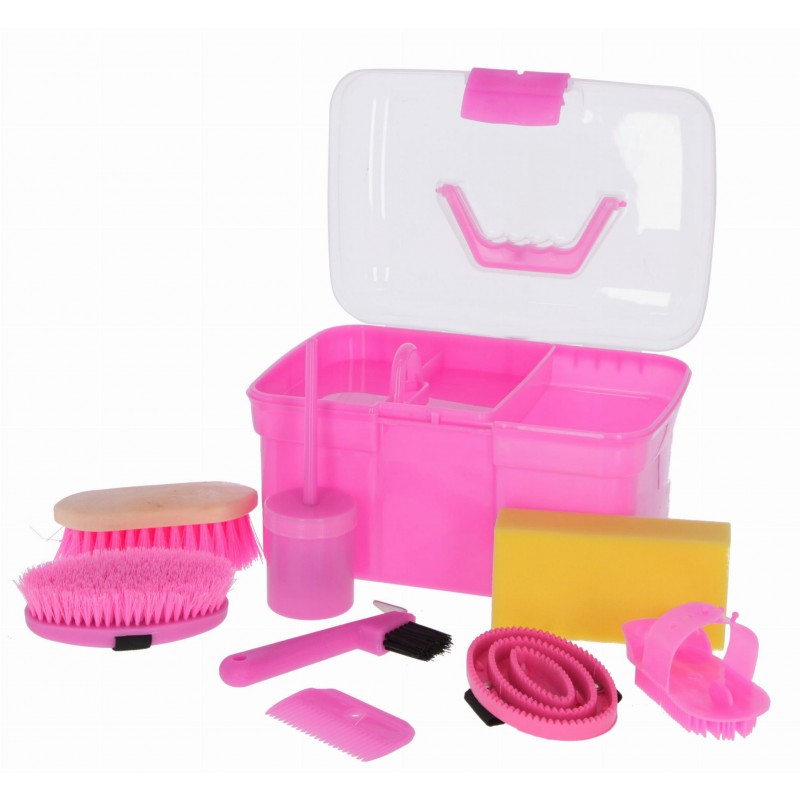 Skrzynka na szczotki w wesołym różowy kolorze. W środku zaopatrzona w wyjmowaną półeczkę. Skrzynka wyposażona jest w podstawowe niezbędne akcesoria do pielęgnacji konia. Taki zestaw idalnie sprawdzi się na wyjazdy, zawody. Jest to także znakomity pomysł na prezent.