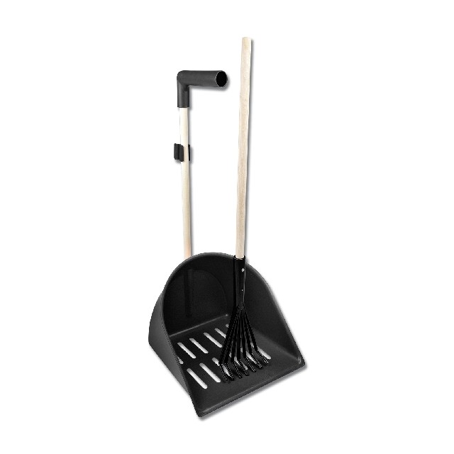 Zestaw do czyszczenia obornika firmy Waldhausen. Posiada specjalne szczeliny, dzięki temu podczas sprzątania na ujeżdżalni można łatwo i bezproblemowo oddzielić obornik od wiórów, które wypadają przez szczeliny na dole szufli. Został wykonany z wysokiej jakości tworzywa sztucznego. Można również stosować go do czyszczenia stanowisk oraz wszystkich miejsc do, których stosuje się ściółkę lub wióry.