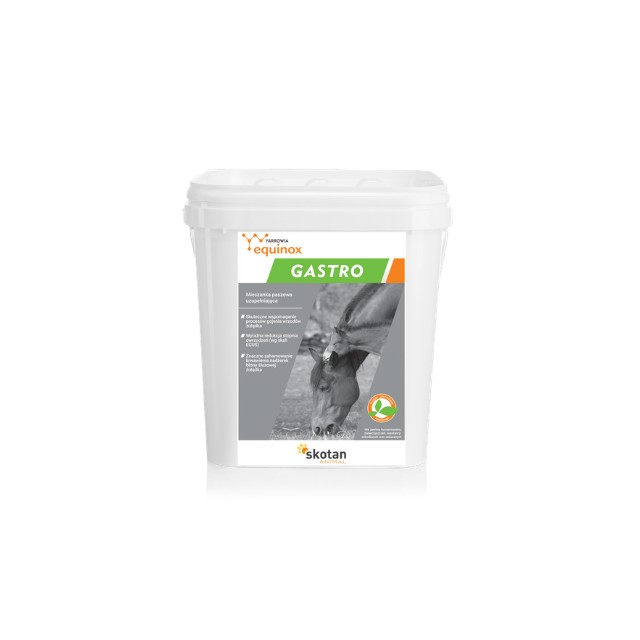 Equinox Gastro to uzupełniająca mieszanka paszowa na bazie unikalnego szczepu drożdży z gatunku Yarrowia lipolytica i bioestrów kwasów omega-3,6 pomaga chronić śluzówkę żołądka i jelit. Formuła wzbogacona o rokitnik sprzyja regeneracji błony śluzowej, wspiera działanie dwunastnicy, żołądka oraz działa regenerująco na układ jelitowy. Mięta pieprzowa i koper włoski łagodzą skurcze mięśni gładkich żołądka i jelit, ograniczają wzdęcia oraz redukują dyskomfort w jamie brzusznej. Mieszanka paszowa uzupełniająca Equinox Gastro dzięki unikalnej kompozycji drożdży z gatunku Yarrowia lipolytica, bioestrów oraz fitobiotyków stanowi doskonałe wsparcie dla koni z problemami układu pokarmowego. Specjalnie opracowana formuła wspiera rozwój naturalnej mikroflory jelitowej oraz pomaga w ochronie błony śluzowej żołądka.