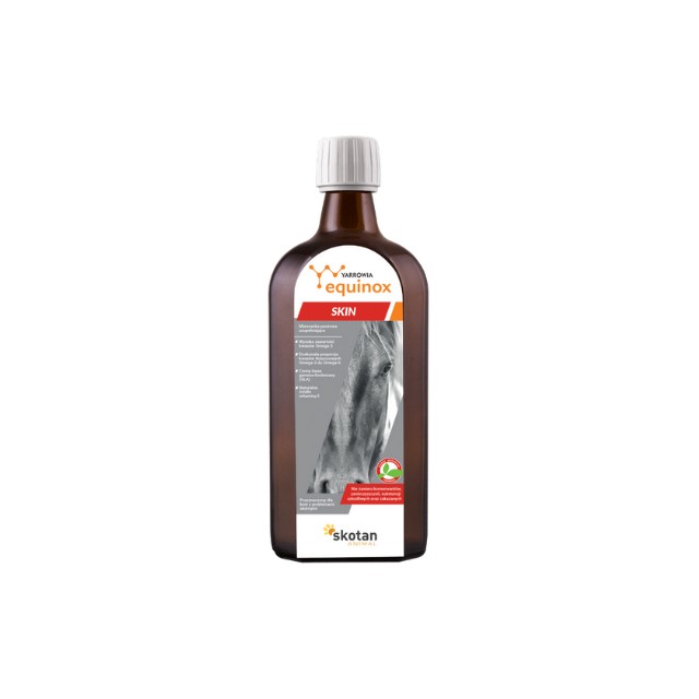 Mieszanka paszowa uzupełniająca Equinox Skin powstaje z mieszaniny tłoczonych na zimno olejów roślinnych bogatych w kwasy tłuszczowe omega-3,6,9. Specjalna kompozycja oleju lnianego, oleju z wiesiołka, oleju z ogórecznika oraz oleju z pestek czarnej porzeczki w formie bioestrów sprawia, że produkt jest wysoce przyswajalny i łatwo dostępny dla organizmu. Zawarta w estrach witamina E pomaga w ochronie komórek przed stresem oksydacyjnym. Zawarte w preparacie estry kwasów omega-3 pomagają zmniejszyć poziom substancji prozapalnych oraz przyczyniają się do poprawy kondycji skóry i okrywy włosowej.