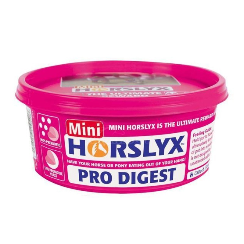 Lizawka horslyx "Pro Digest" wspiera układ pokarmowy konia- zawiera żywe drożdże probiotyczne, prebiotyki MOS, wodorosty oraz korę z wiązu czerwonego. Sprawdzi się dla wrzodowców i koni starszych, które mają problemy z przyswajaniem pokarmu, zaleczając stany zapalne żołądka i jelit. Idealna przy antybiotykoterapii - działa osłonowo. Ma zwiększona dawkę magnezu- działanie uspokajające.