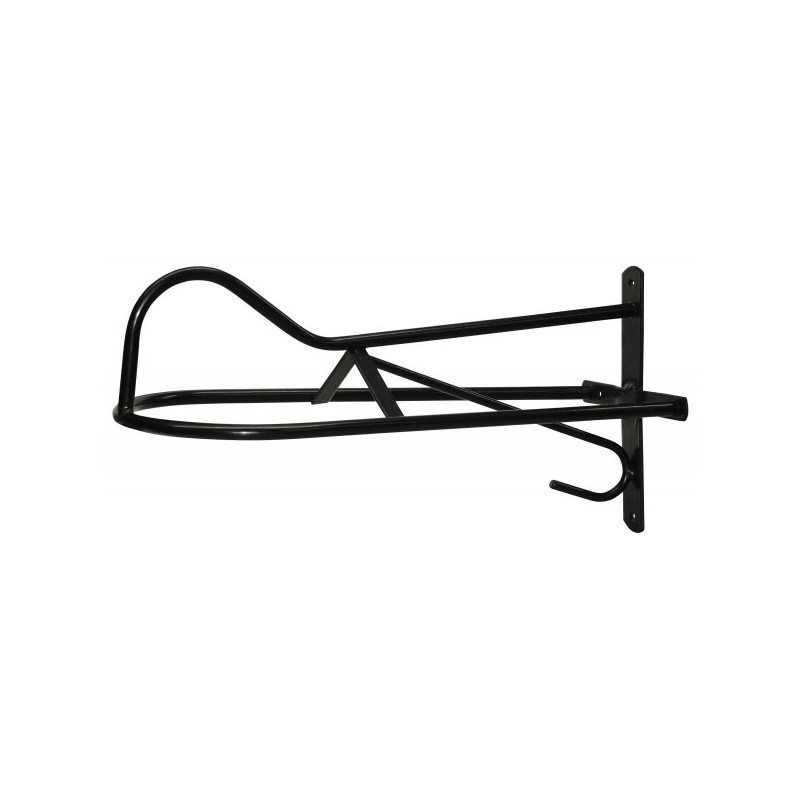 Wieszak na siodło westernowe do zawieszenia na ścianie. Pod spodem posiada haczyk, do zawieszenie ogłowia. Wieszak trwały, wykonany z metalu.