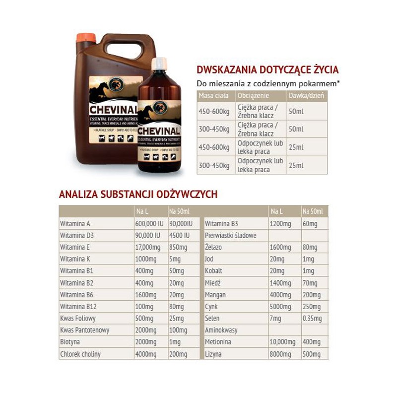 CHEVINAL Plus Syrop to wysokiej jakości suplement zawierający witaminy, minerały oraz aminokwasy. Jest to mieszanka paszowa niezbędna dla koni sportowych, pracujących, czy wracających do formy po chorobie.
