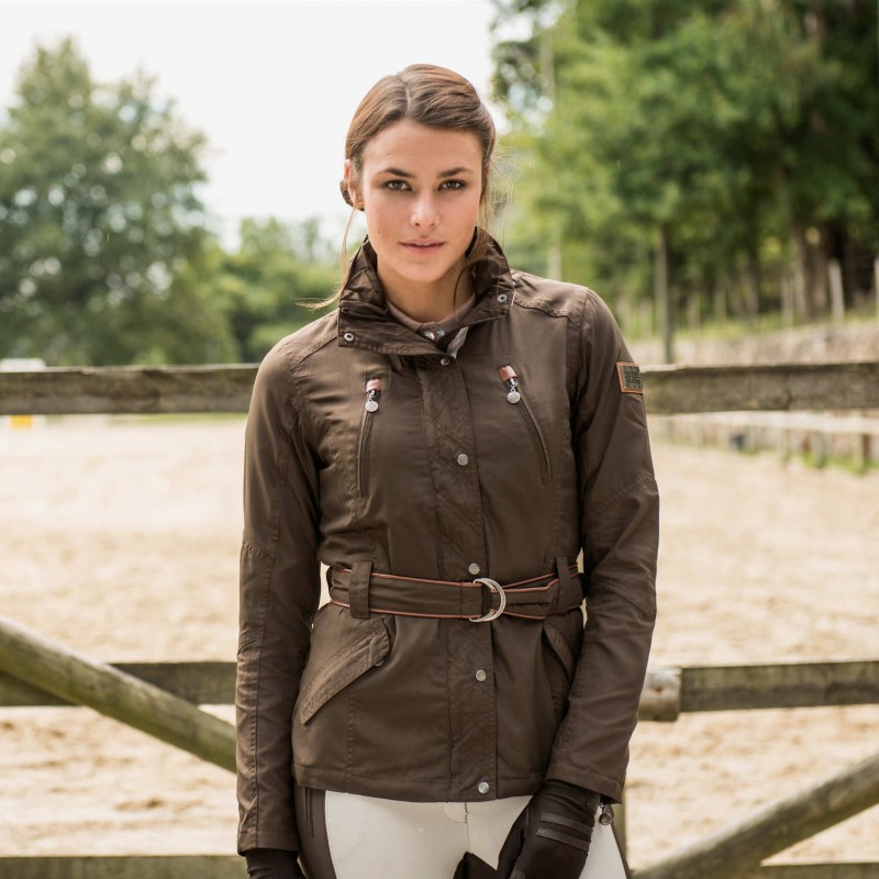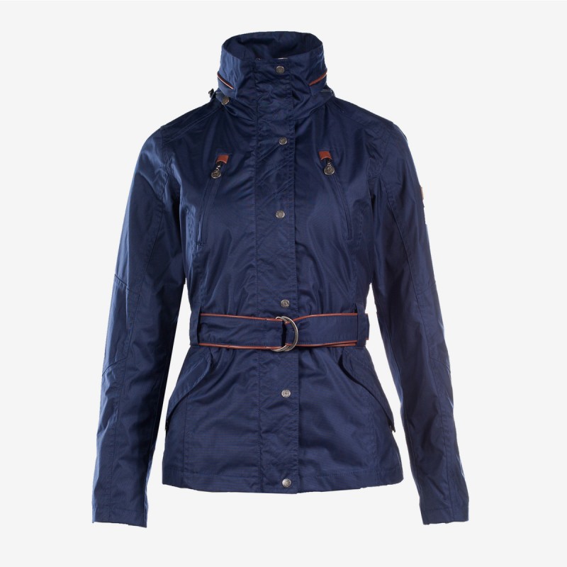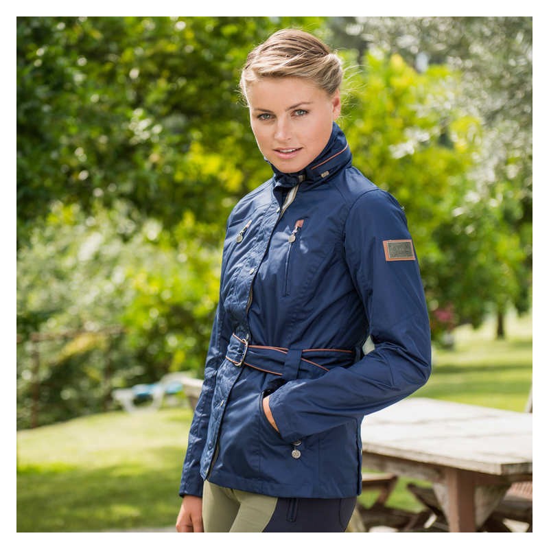 Elegancka damska kurtka Horze "Norah" z kolekcji "Crescendo". Wykonana z wodoodpornej i wiatrochronnej tkaniny. Zapinana na dwustronny zamek błyskawiczny oraz dodatkowo zapinana na napy. Z tyłu patki rozpinane do jazdy. Wykończenia z jasnobrązowej skóry ekologicznej. Wysoka stójka. Posiada cztery kieszonki z przodu oraz pasek w talii. Niezwykle łatwa do czyszczenia.