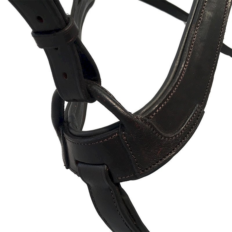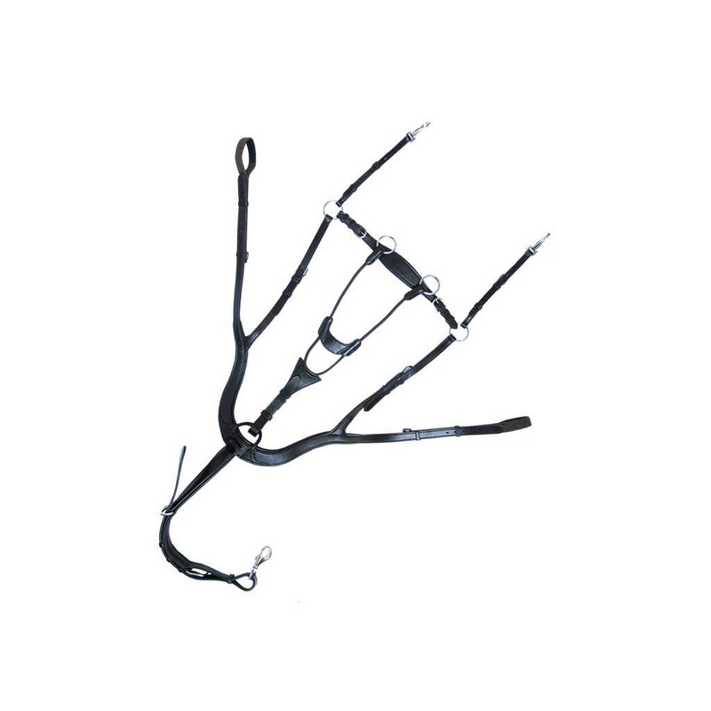 Napierśnik pięciopunktowy z wytokiem wykonany z wytrzymałej a zarazem miękkiej skóry. Anatomiczny krój ułatwia dopasowanie do konia. Posiada gumowe, elastyczne wstawki oraz sprzączki i okucia ułatwiające pracę.